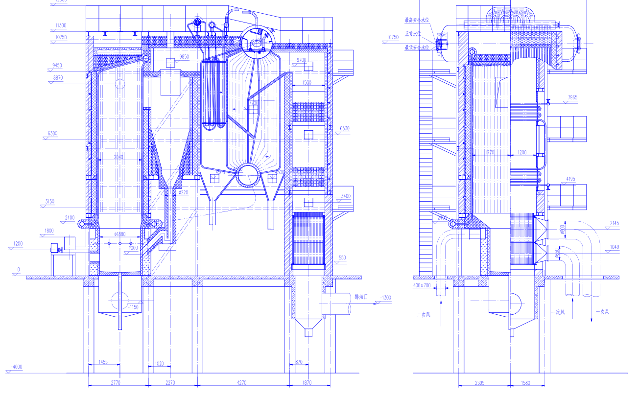 SHX20-1.25-AII 鍋爐為雙鍋筒橫置自然循環(huán)鍋爐,鍋爐房雙層布置,鍋爐運(yùn)轉(zhuǎn)平臺(tái)高度一般為4000mm。鍋爐本體基本尺寸:鍋爐上鍋筒為Φ1400×16,中心標(biāo)高10750;下鍋筒為Φ900×14,中心標(biāo)高4650,安裝完畢后外圍尺寸為13270×8430×12500 (長(zhǎng)×寬×高)。
